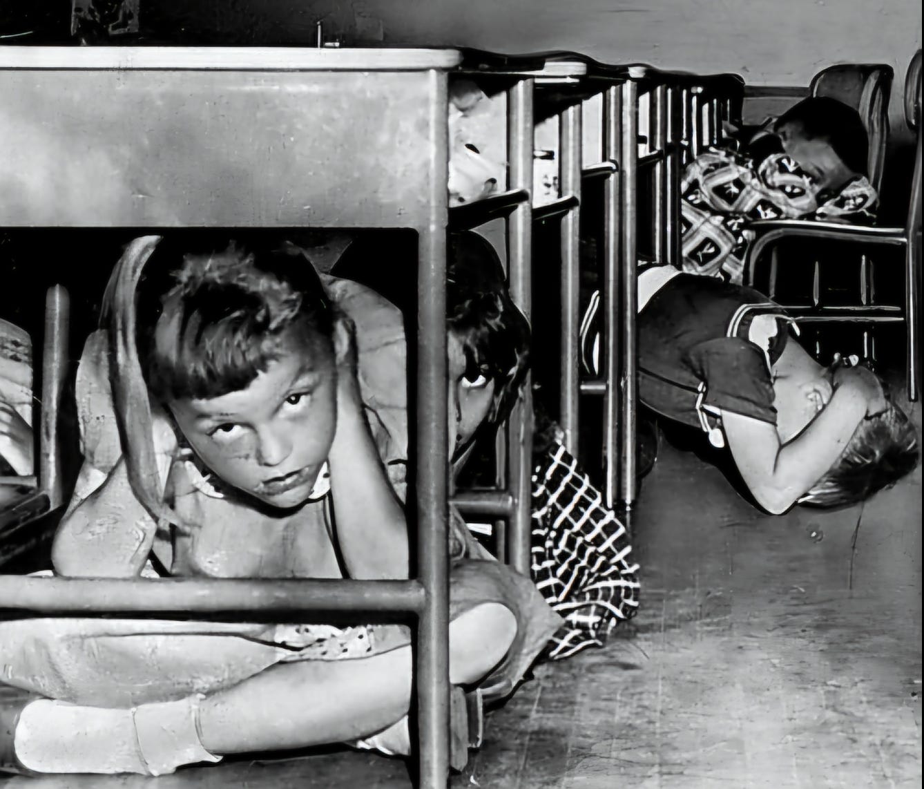 During our Duck and Cover drill in Mrs. Howard’s class, Stanley didn’t want to get under his desk and said, “My Dad said this is stupid.”